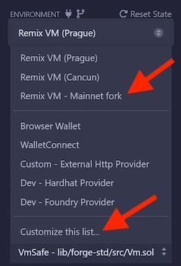 If you don’t see the Remix VM Mainnet or Remix VM Custom Fork options, you’ll need to select the Customize this link which will open a tab of options in Remix’s Main Panel.