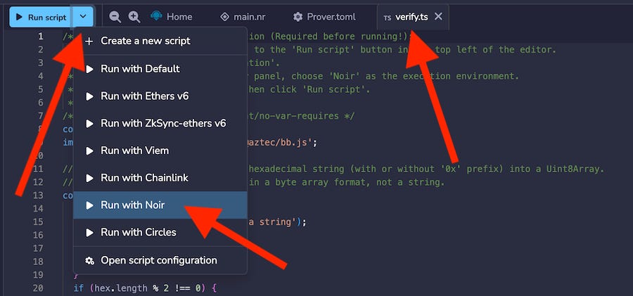 To run the verify.ts file, you will need to switch Remix’s default script dependencies. This is done in the Script Configuration panel. Open this panel by clicking on the caret near the Run script button.