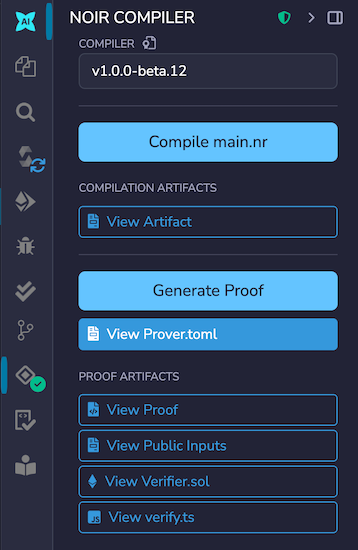 Files associated with the buttons: View Proof, View Public Inputs, View Verifier.sol, and View verify.ts are of course in the File Explorer.